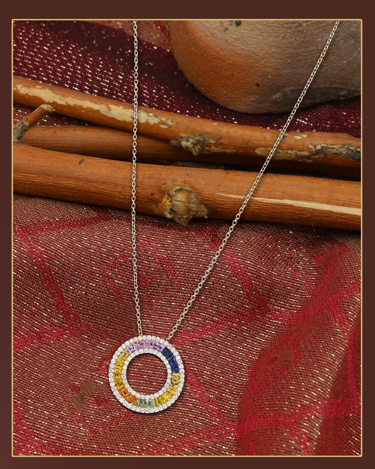 The outer circle is delicately set with brilliant diamonds, adding a luminous halo effect, while the inner circle is adorned with carefully arranged multicolor gemstone accents that bring a soft yet vibrant contrast. With a total diamond weight of 0.40 carats, the pendant offers a graceful sparkle that enhances its contemporary charm without overwhelming the design.
