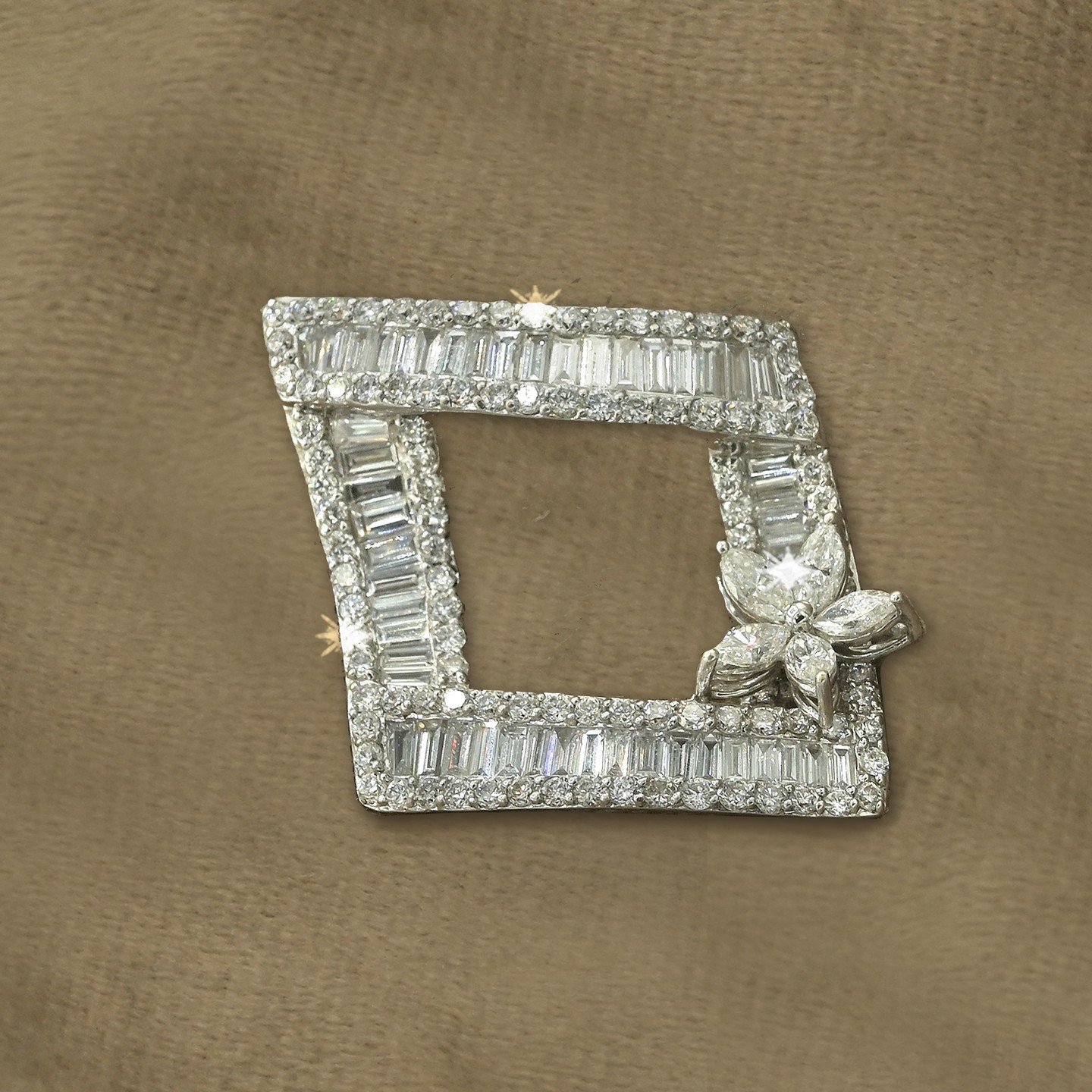 This 6.864-gram gold pendant is a true blend of contemporary style and refined elegance. Its standout geometric frame is lined with baguette-cut and round diamonds, totaling 3 carats of radiant sparkle. The clean, angular shape is beautifully softened by a finely crafted floral motif placed on one corner, adding grace and charm to the overall design.