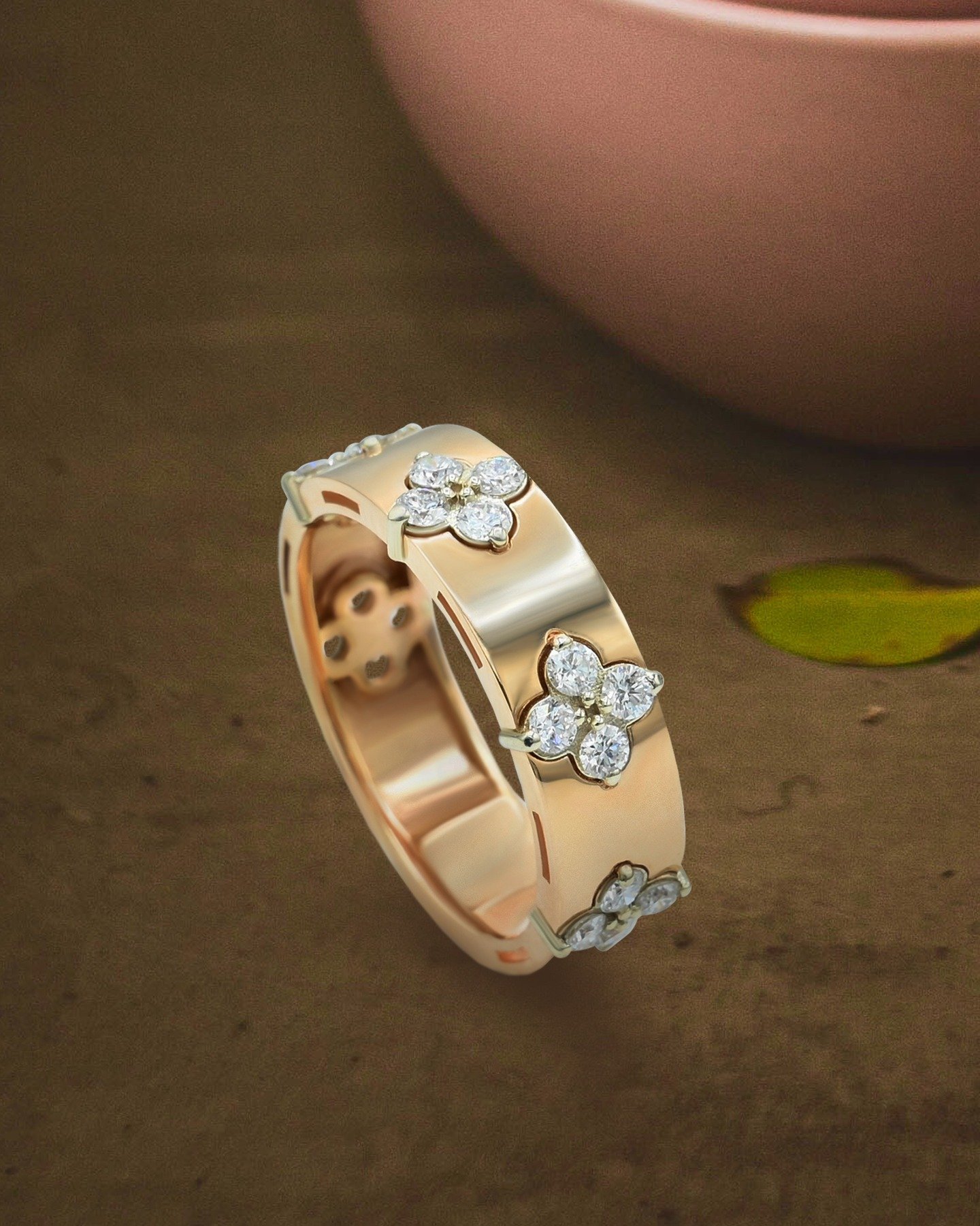 Set with 0.75 carats of sparkling diamonds, each floral motif is meticulously crafted to enhance light reflection while maintaining a smooth, comfortable profile. The polished rose gold finish adds warmth and elegance, making the ring ideal for daily wear as well as special occasions.